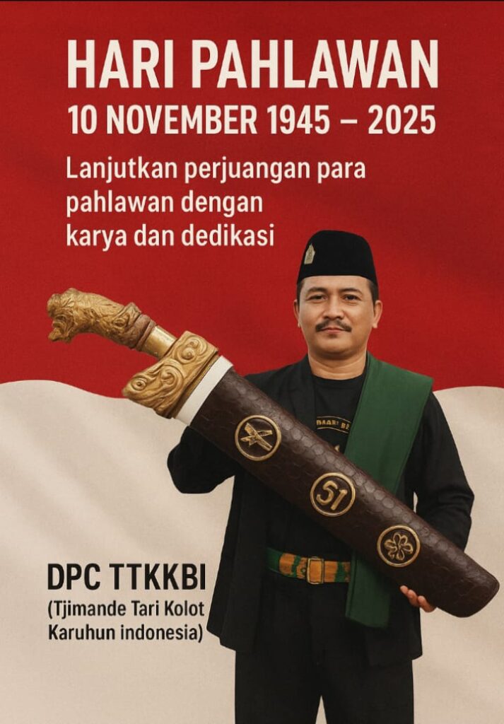 Tangerang, – Dalam rangka memperingati Hari Pahlawan 10 November 1945 – 2025, Dewan Pimpinan Cabang (DPC) TTKKBI Cimande Tari Kolot Karuhun Indonesia mengajak generasi muda untuk melanjutkan semangat juang pahlawan. Ketua DPC TTKKBI, Yaman Kalahideung, menyatakan bahwa semangat juang tidak boleh padam oleh waktu.