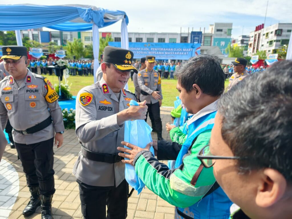 Sebagai wujud dukungan terhadap kesejahteraan pengemudi, Kapolda menyerahkan paket sembako kepada perwakilan ojol dan warga yang membutuhkan. Ia juga menyerahkan secara simbolis kunci operasional Ojol Mart, yang kini telah berdiri sebanyak 12 unit sebagai bentuk pemberdayaan UMKM dari ojol untuk ojol.
