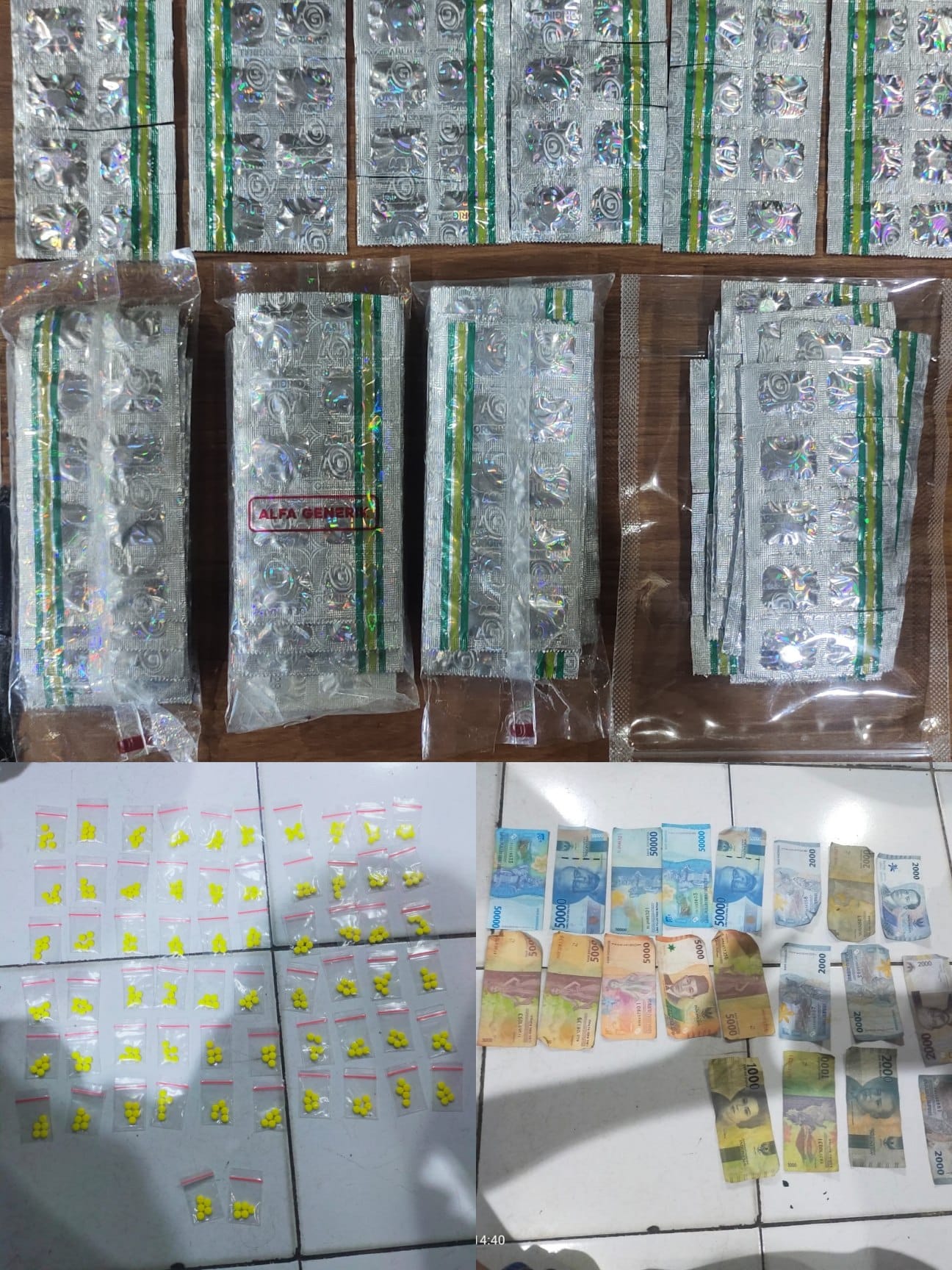 Dari tangan terduga pelaku, petugas berhasil mengamankan barang bukti berupa 404 butir obat keras jenis Hexymer, 459 butir Tramadol, uang tunai hasil penjualan sebesar Rp298.000, serta sejumlah barang pendukung lainnya.